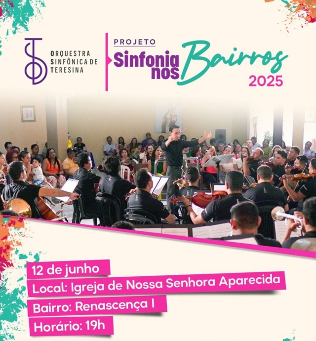 A Orquestra Sinfônica de Teresina segue encantando os bairros da capital com o projeto “Sinfonia nos Bairros 2025”. Nesta quinta-feira, 12 de junho, a apresentação será realizada na Igreja de Nossa Senhora Aparecida, localizada no bairro Renascença I, a partir das 19h.